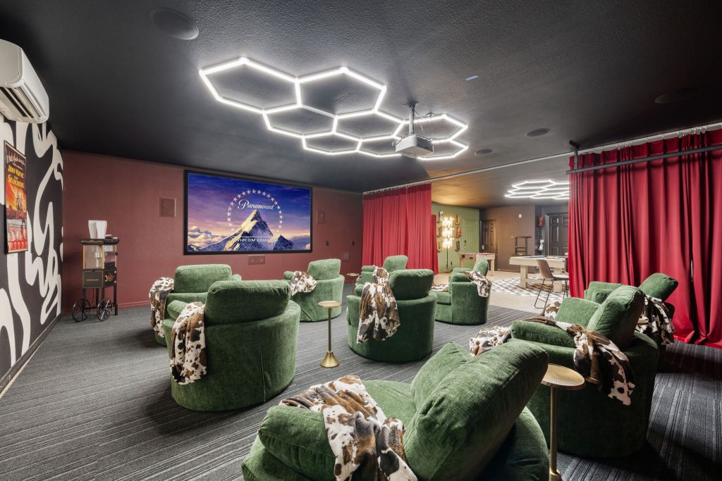 Immerse yourself in Rodeo Ranch’s Dolby Atmos theater and game lounge — where plush emerald recliners, cinematic surround, and hex-light ceilings meet a full game zone featuring pool, foosball, arcades, shuffleboard, giant Jenga, and karaoke. The ultimate space for movie nights, friendly rivalry, and Texas-style fun.
