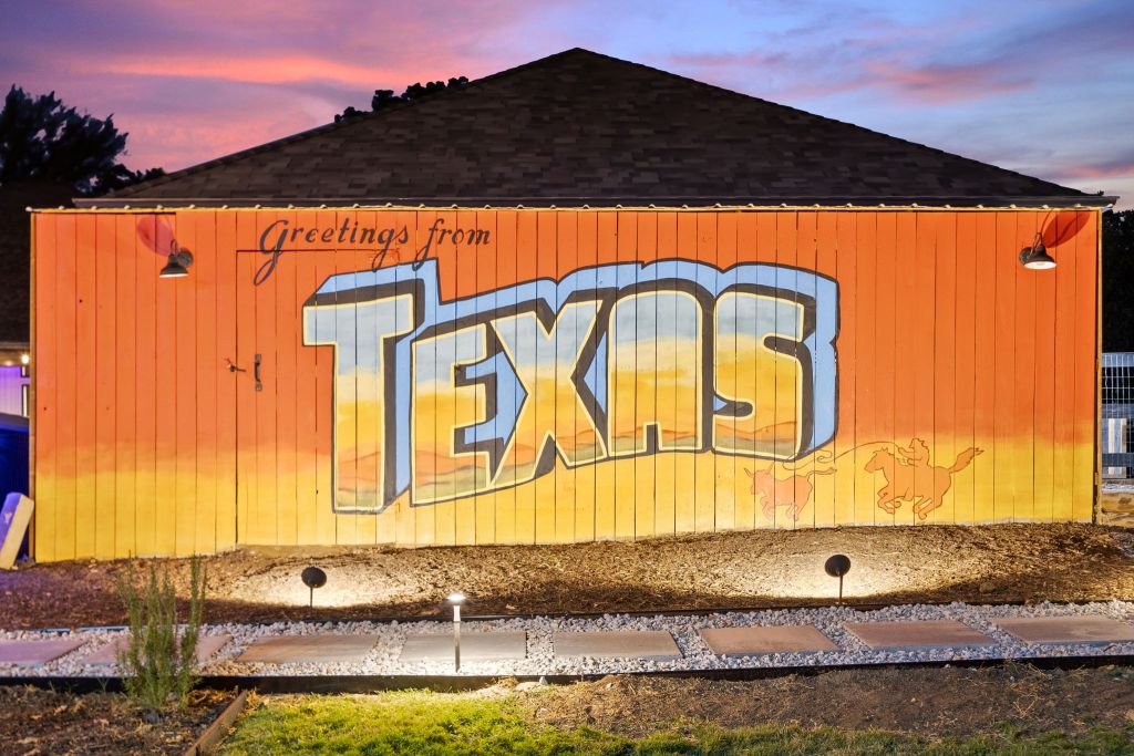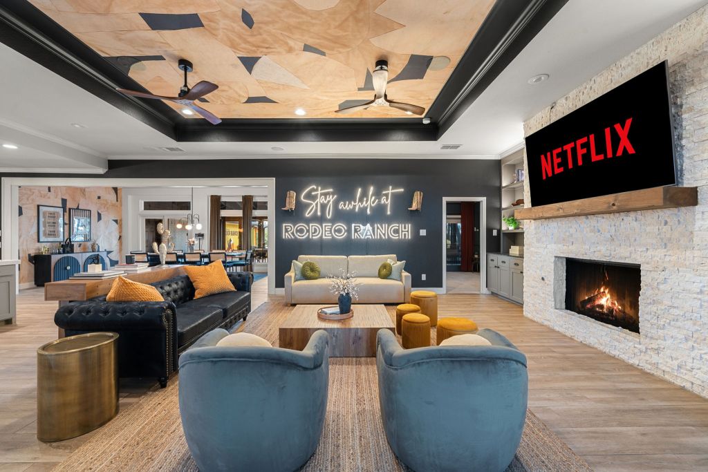 The open-concept living room invites guests to gather around the fireplace, stream their favorite shows on the oversized smart TV, and relax beneath custom wood-inlay wallpaper ceiling. Bold textures, velvet seating, and the glowing Stay Awhile at Rodeo Ranch neon sign set the scene for unforgettable Texas stays.